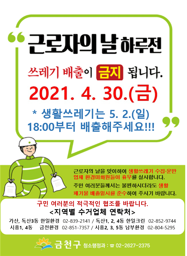 [시민일보 = 여영준 기자] 서울 금천구(구청장 유성훈)는 5월1일 ‘근로자의 날’을 맞아 생활폐기물 수집·운반 업체 환경미화원들이 휴무를 실시함에 따라 오는 30일 오후에 생활쓰레기를 수거하지 않는다고 밝혔다.