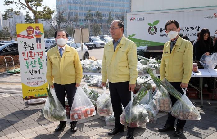 김지철 충남교육감(왼쪽)이 교육청 앞에서 개학 연기로 납품이 중단된 학교급식용 채소와 과일꾸러미를 직접 구매하고 있다.