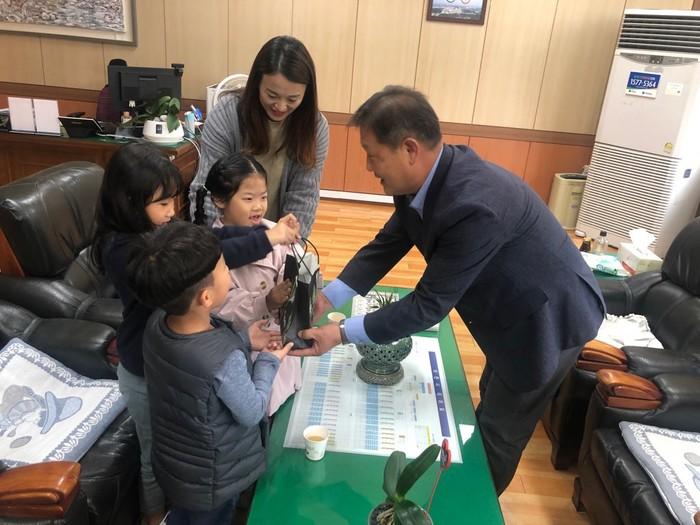 경기 이천시 백사면 소재 창조아트어린이집은 최근 행정복지센터를 방문해 어려운 이웃을 위한 성금 43만3000원을 기탁했다. 이 어린이집은 매년 바자회 등을 통해 얻은 수익금을 기탁해왔다. 사진은 어린이들이 직접 성금을 전달하는 모습. (사진제공=이천시청)