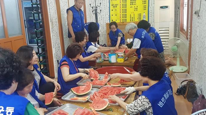 경기 구리시 교문2동은 최근 바르게살기위원회와 함께 지역내 13개 경로당을 찾아 노인들에게 시원한 화채를 대접했다. 이날 봉사자들은 화채를 대접하고, 무더운 여름철 노인들의 건강과 불편사항도 살폈다. 사진은 화채를 준비하는 봉사자들의 모습. (사진제공=구리시청)