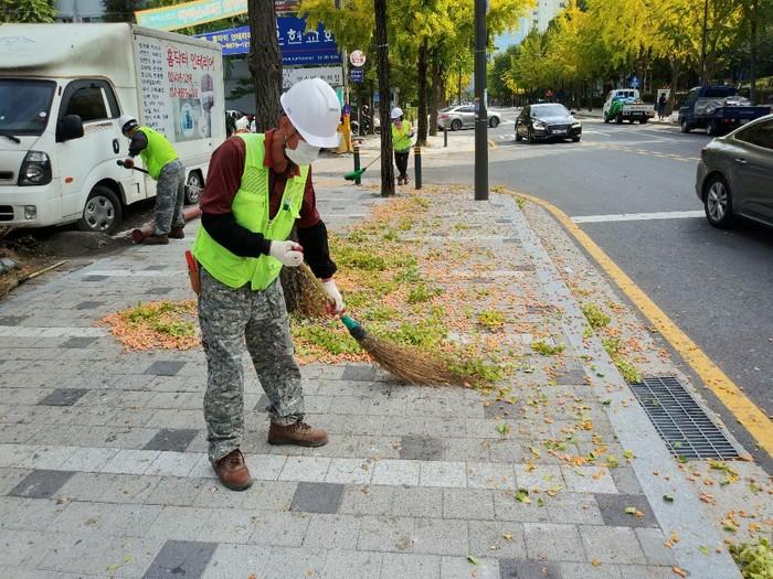 22일 구에 따르면 기동반은 지난 9월21일부터 버스정류장, 지하철 출입구, 상가밀집지역 등 주민 통행이 많은 지역부터 대나무 장대를 이용해 조기 열매 털이작업을 시행했다.