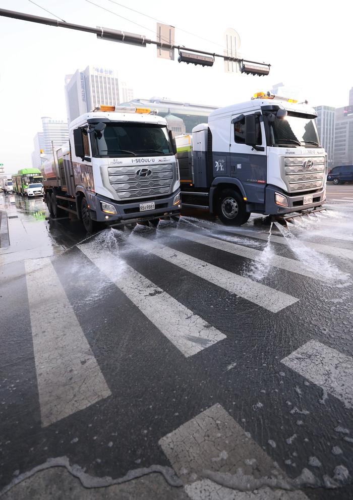 서울과 인천, 경기 등 수도권 전역에 미세먼지 비상저감조치가 시행된 11일 오전 서울 중구 태평로 덕수궁 대한문 앞에서 중구청 물청소 차량이 도로 물청소를 하고 있다.