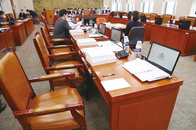 25일 국회 문화체육관광위원회 전체회의에서 여야 동료의원들의 좌석이 비어 있다. 도종환 국회 문화체육관광위원장은 이날 전체회의를 시작하며 코로나19 확산을 막기 위해 질의하는 의원과 다음 질의할 의원 외 의원들은 회의장 밖에서 대기해줄 것을 요구해, 회의장 안에 머무르는 인원을 최소화하는 조치를 취했다.