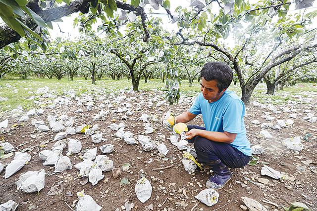 오전 전남 순천시 낙안면 신기마을에서 김근철씨가 태풍 '링링'으로 땅에 떨어진 배를 주어 상태를 확인하고 있다. 낙안면에서는 180 농가 가운데 50% 이상이 낙과 피해를 것으로 집계됐다.