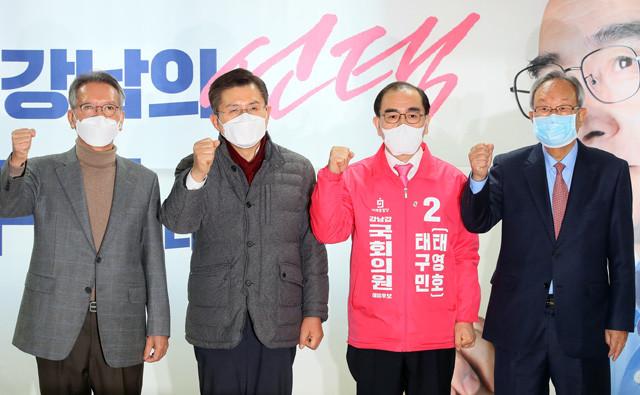 김형오 공천관리위위원장(왼쪽부터), 황교안 대표, 태구민(태영호) 서울 강남갑 국회의원 예비후보, 박관용 국회의장이 22 서울 강남구 도산대로 후보 선거사무소에서 필승을 다짐하고 있다.