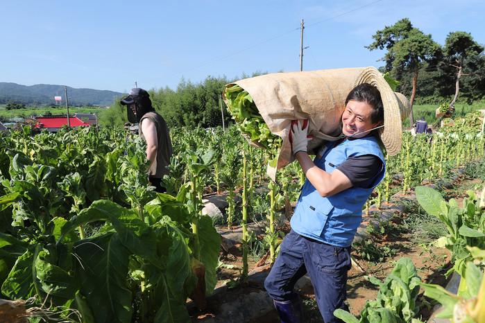 봉사활동에 참여한 22명의 KT&G 원료본부 및 김천공장 임직원들은 지난 13일 김제시 봉남면의 잎담배 농가를 방문해 5000㎡(1500평)의 농지에서 약 3000kg의 잎담배를 수확했다.