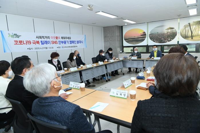경기 구리시는 27일 구리시지역사회보장협의체 주관으로 코로나19 극복 릴레이 SNS 안부 묻기 캠페인 ‘사회적 거리 이웃愛로 채워주세요’의 시작을 알리는 발대식을 개최했다. 사진은 안승남 시장이 발대식을 진행하고 있는 모습. (사진제공=구리시청)