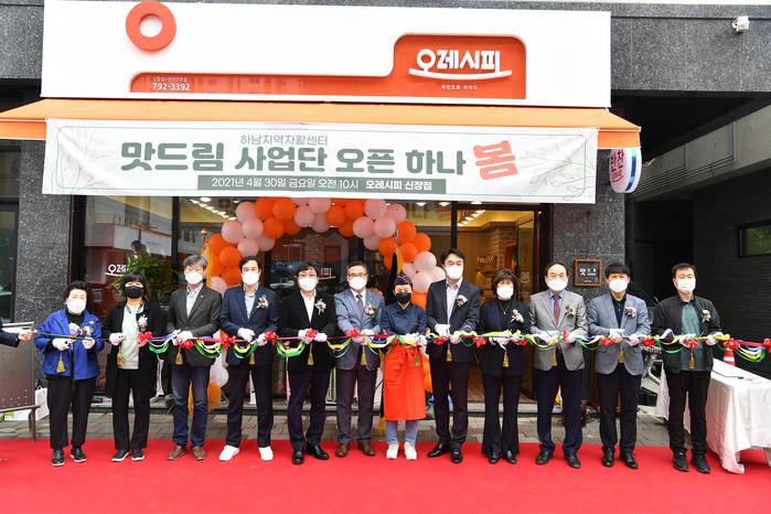 경기 하남지역자활센터 맛드림사업단은 최근 저소득 주민의 자활·자립을 돕기 위한 반찬가게 ‘오레시피 신장점’을 문 열었다. 사진은 이날 개소식에 참석한 김상호 시장(오른쪽 다섯 번째)이 관계자들과 테이프 커팅을 하는 모습. (사진제공=하남시청)