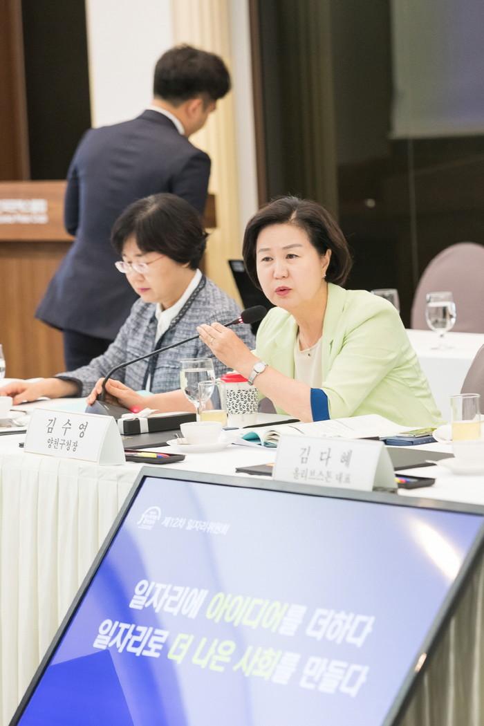 대통령 직속 일자리위원회 제2기 위촉직 민간위원으로 위촉된 김수영 양천구청장이 3일 한국프레스센터에서 열린 '일자리위원회 제12차 회의'에 참석했다. 사진은 회의에 참석한 김 구청장이 의견을 말하고 있는 모습. (사진제공=양천구청)