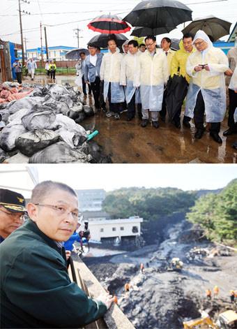 5 태풍 ‘미탁’ 침수피해 지역인 동해시 송정동을 방문한 이해찬 더불어민주당 대표가 피해 마을을 둘러보고 있다(위). 자유한국당 황교안 대표가 4 오후 부산 사하구 구평동 산사태 현장을 방문, 매몰자 구조상황을 살펴보고 있다.