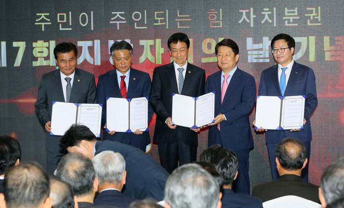 시군자치구의회 의장협의회 강필구 회장(왼쪽부터), 시도의회의장협의회 신원철 회장, 진영 행정안전부 장관, 시도지사협의회 권영진 회장, 시장군수구청장협의회 염태영 회장이 30일 세종시 지방자치회관에서 열린 제7회 지방자치의날 기념식에서 '자치분권 균형발전을 위한 세종선언문'을 채택하고 있다.