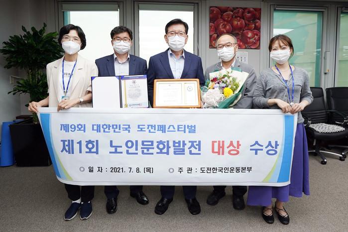 서울 동대문구가 8일 ‘제9회 대한민국 도전페스티벌’에서 ‘2021년 제1회 노인복지문화 대상’을 받았다. 구는 경로당 운영비 지원을 아끼지 않고 있으며, 노인여가시설 환경을 개선하고 노인 참여 프로그램을 매년 확대하는 점 등을 인정받았다. 사진은 대상 수상 기념으로 유덕열 구청장(가운데)이 직원들과 기념촬영을 하고 있는 모습. (사진제공=동대문구청)