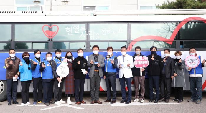 경기 수원남부로타리클럽은 27일 권선구청 주차장에서 이웃사랑 실천을 위한 헌혈봉사를 실시했다. 사진은 이날 길영배 구청장(가운데)과 헌혈봉사 관계자들이 기념촬영을 하는 모습.(사진제공=권선구청)