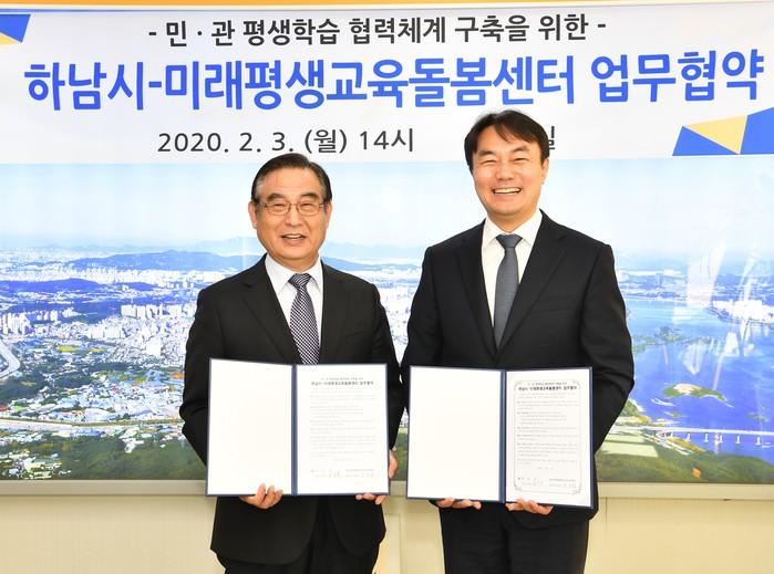 경기 하남시가 민간영역의 평생학습 활성화를 위해 3일 시장실에서 미래평생교육돌봄센터와 '민·관 평생학습 협력체계' 구축을 위한 업무협약을 체결했다. 사진은 김상호 시장(오른쪽)과 임은빈 센터장이 협약서를 들고 기념촬영을 하는 모습. (사진제공=하남시청)