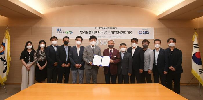 경기 오산시가 지난 9일 (주)SBS와 시에 조성 중인 '반려동물 테마파크' 활성화를 위한 업무협약을 체결했다. 이날 협약식에는 곽상욱 시장, 박정훈 대표이사를 포함한 TV프로그램 동물농장 방송 관계자들이 참석했으며, 동물복지와 콘텐츠 정보를 공유하고 협력함으로써 성숙한 반려문화 조성과 반려산업 발전에 상호 협력하기로 했다. 사진은 곽 시장(오른쪽 여섯 번째)과 관계자들이 기념촬영을 하는 모습. (사진제공=오산시청)