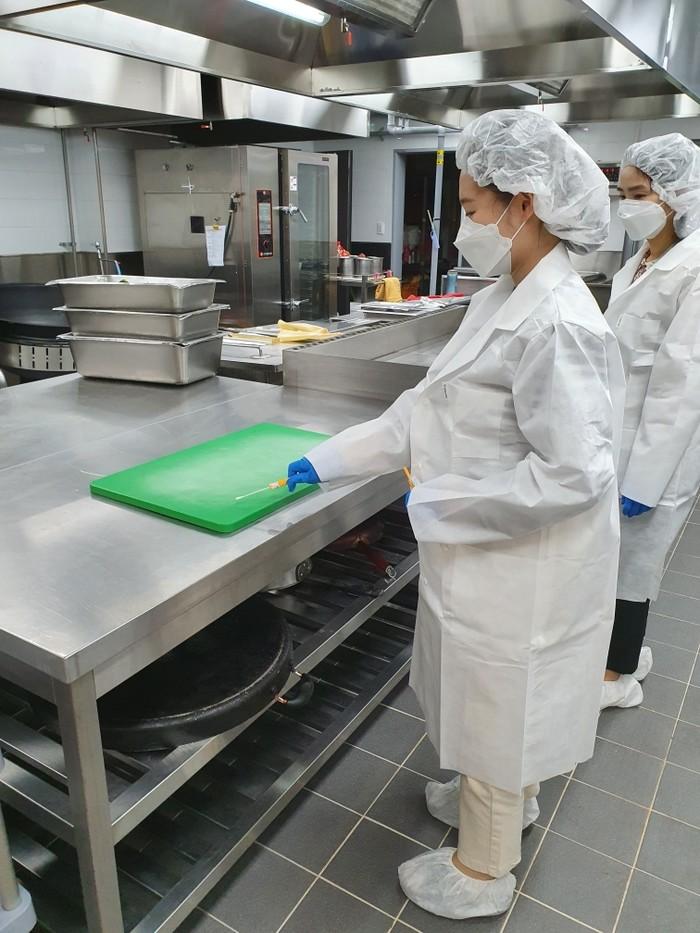 경기 부천시는 최근 현장대응 역량 강화를 위한 식중독 대비 모의훈련을 했다. 훈련은 집단급식소에서 점심을 취식한 280명 중 20명의 식중독 의심환자가 발생한 상황을 가정해 진행됐다. 사진은 검체 채취 시연을 하고 있는 모습. (사진제공=부천시청)