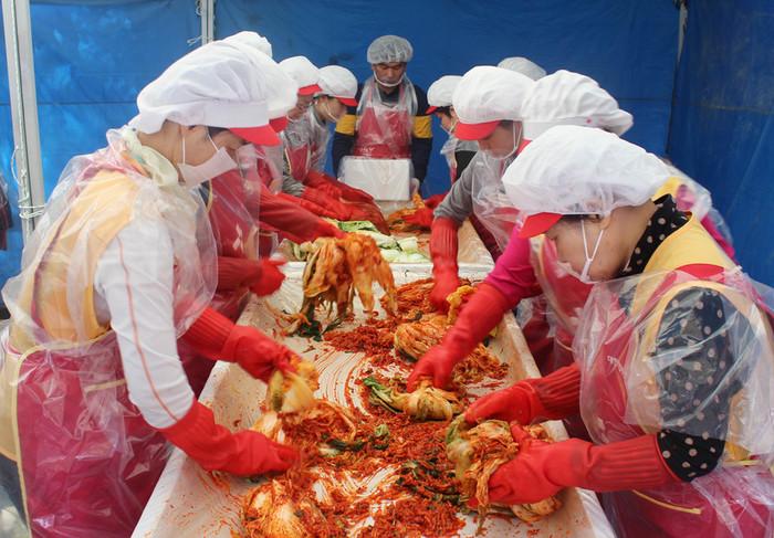 삼정KPMG 임직원들이 지난 2일 대한적십자사 서울시지사와 함께 남부봉사관에서 동작구·관악구 취약계층 400가구에 전달할 김치 3200kg을 담갔다. 사진은 참여자들이 김장을 하고 있는 모습. (사진제공=대한적십자사 서울시지사)