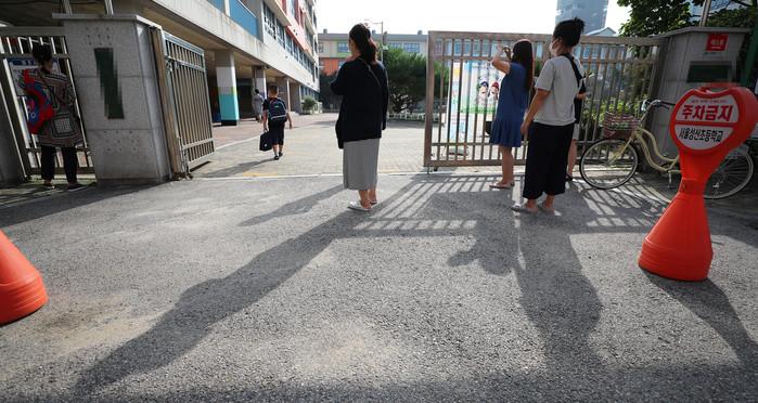 정부는 코로나19 확산을 막기 위해 수도권 유치원과 초·중·고교의 등교 수업을 26일부터 다음 달 11일까지 원격 수업으로 전환하기로 결정했다. 사진은 이날 오전 서울 마포구의 한 초등학교에서 등교하는 학생들을 바라보는 학부모 모습.
