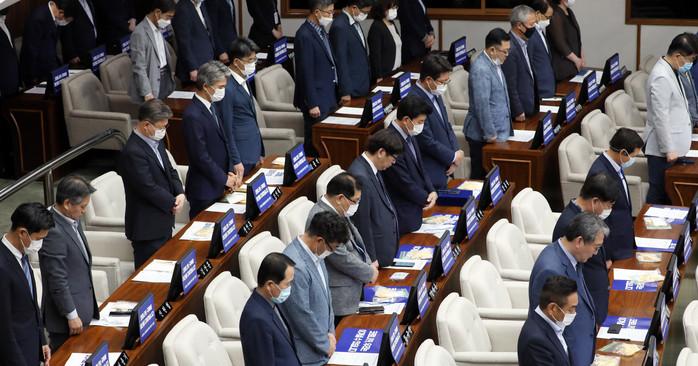 14일 서울시의회에서 열린 제296회 임시회에서 참석자들이 고 박원순 시장에 대한 묵념을 하고 있다.