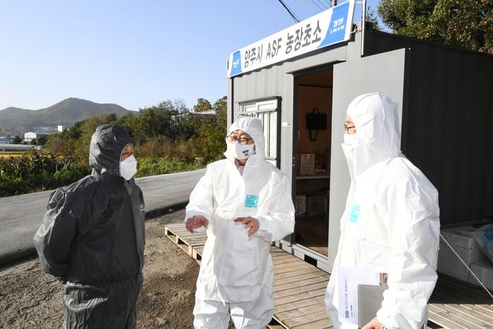 조학수 경기 양주시 부시장은 최근 아프리카돼지열병(ASF) 등 가축전염병 예방·확산 방지를 위해 차단방역에 총력을 기울이고 있는 은현면 소재 거점소독소와 농가초소를 방문했다. 사진은 이날 조 부시장(가운데)이 차단방역대책 추진상황을 점검하고 장기간 ASF 방역 최일선에서 근무하는 비상근무자를 격려하고 있는 모습. (사진제공=양주시청)