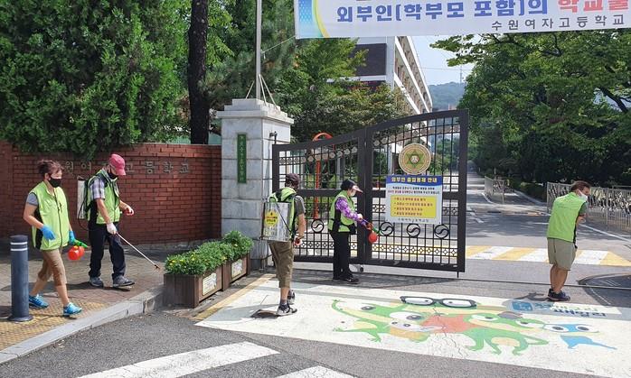 경기 수원시 팔달구 고등동은 최근 개학을 맞아 수원희망6000 일자리사업 참여자와 함께 지역내 학교 2곳(수원초등학교·수원여자고등학교) 주변에 일제 방역을 실시했다. 사진은 학교 주변을 방역작업하고 있는 모습. (사진제공=팔달구청)
