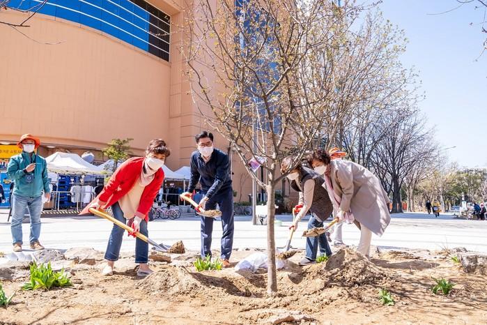서울 강동구는 5일 제76회 식목일을 맞이해 고덕로 가로 숲 조성지에 기념식수와 길동사거리 교통섬에 아름다운 초화를 식재했다. 사진은 이날 이정훈 구청장(가운데)이 고덕동 가로정원 조성지에서 가로숲과 어울리는 기념식수목을 식재하고 있는 모습. (사진제공=강동구청)