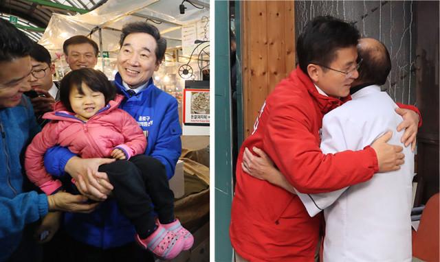 후보로 4.15 총선 종로에 출마하는 이낙연 국무총리가 15 오후 서울 종로구 광장시장을 방문해 어린이를 안아보고 있다(왼쪽). 자유한국당 황교안 대표가 15 오후 서울 종로구 혜화동 문화이용원에서 이발사 지덕용 씨와 포옹하고 있다.