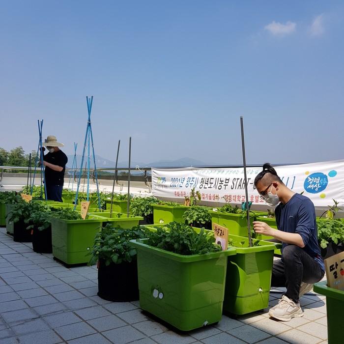 경기 양주시가 지난 8일 ‘청년도시농부 START-UP 교육’ 수료식을 개최했다. 농업기술센터와 경동대학교 호텔조리학과가 추진한 이번 교육은 개인 상자텃밭에 상추·토마토 등을 심고 가꿔, 수확물로 요리해 먹을거리에 대한 소중함을 느끼는 과정으로 진행됐다. 사진은 교육생들이 개인 상자텃밭을 돌보고 있는 모습. (사진제공=양주시청)
