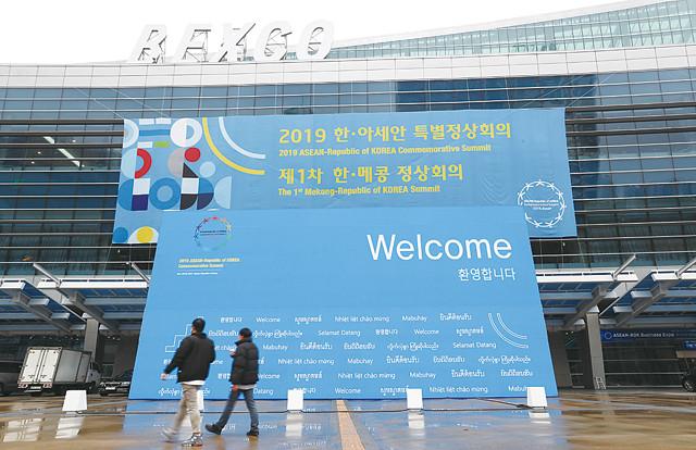 2019 한·아세안 특별정상회의를 하루 앞둔 24 오전 부산 벡스코에서 취재진과 시민들이 분주히 이동하고 있다.