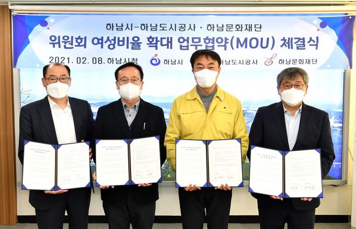 경기 하남시가 '하남형 여성친화도시' 조성을 위해 8일 하남도시공사와 하남문화재단과 위원회 여성비율 확대 업무협약을 체결했다. 이날 협약에 따라 도시공사와 문화재단은 위원회 구성 시 특정 성별이 위촉직 위원 수의 60%를 초과하지 않도록 노력하기로 했다. 사진은 김상호 시장(오른쪽 두 번째)이 협약 체결 후 관계자들과 기념촬영을 하는 모습. (사진제공=하남시청)