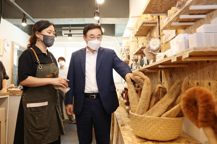 이동진 서울 도봉구청장이 21일 방학천문화예술거리에 문을 연 '제로웨이스트샵 안녕상점'을 찾아 축하했다. 안녕상점은 환경을 보호하기 위해 ‘제로웨이스트’를 실천하는 협동조합으로 기후위기 인식 및 대응교육·실천활동 프로젝트 기획 운영 등을 진행한다. 사진은 이동진 구청장(오른쪽)이 안녕상점 대표와 함께 천연 수세미 등 상품을 둘러보고 있는 모습. (사진제공=도봉구청)