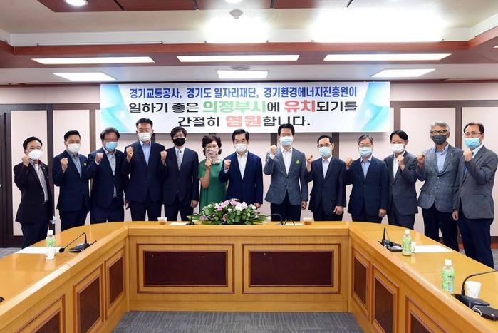 경기도 산하기관(경기교통공사, 경기도 일자리재단, 경기환경에너지진흥원) 유치 경쟁이 한창인 가운데 안병용 의정부시장이 도 산하기관의 유치 홍보릴레이 영상 촬영에 참여했다. 사진은 유치 홍보에 참여한 안 시장(가운데)과 관계자들이 기념촬영을 하는 모습. (사진제공=의정부시청)