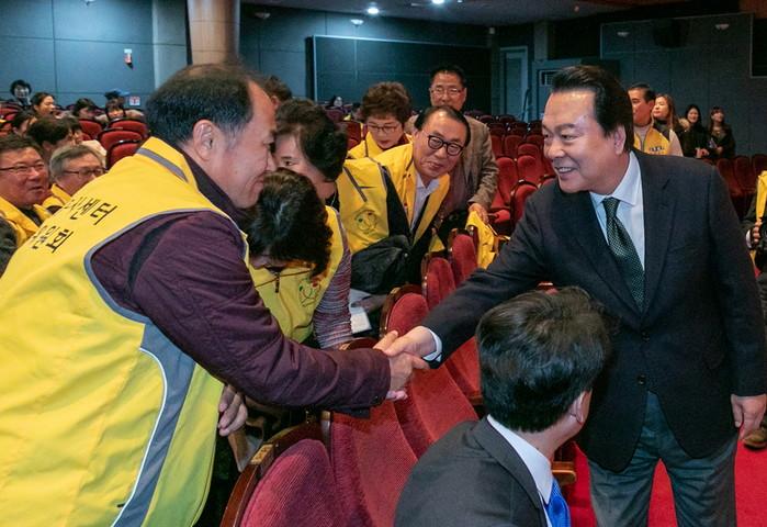 서울 강서구는 19일 강서구민회관에서 자원봉사자 500여명이 참석한 가운데 ‘자원봉사자 만남의 날 기념식’을 개최했다. 사진은 이날 기념식에 참석한 노현송 구청장(오른쪽)이 자원봉사자와 악수하며 격려의 말을 전하고 있는 모습. (사진제공=강서구청)