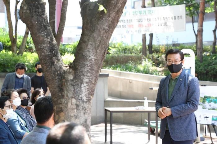 | ▲ 지난 4일 원효로2가 마을휴식공간 정비사업 현장에서 열린 주민들과의 간담회에서 성장현 구청장(오른쪽)이 공사 시행을 알리고 주민들의 의견을 청취하고 있는 모습. (사진제공=용산구청) |