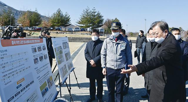 대통령이 9 신종 코로나바이러스 확산으로 중국 우한 교민들이 임시 생활하고 있는 아산 경찰인재개발원에서 관계자의 보고를 받은 대화하고 있다.
