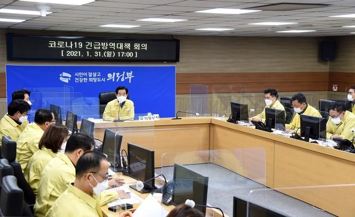 경기 의정부시가 1월31일 정부의 '수도권 사회적 거리두기 2.5단계' 2주 연장조치에 따라 부시장, 코로나19 관련 국과장 및 권역동 국장 등이 참석한 가운데 긴급방역대책회의를 개최했다. 이날 회의에서는 다중이용시설 및 5인 이상 사적 모임 단속 현황을 공유하고 정부의 세부 조정안을 반영한 시설별 점검 방법 및 대책 방안 등을 논의했다. 사진은 안병용 시장이 회의를 주재하는 모습. (사진제공=의정부시청)