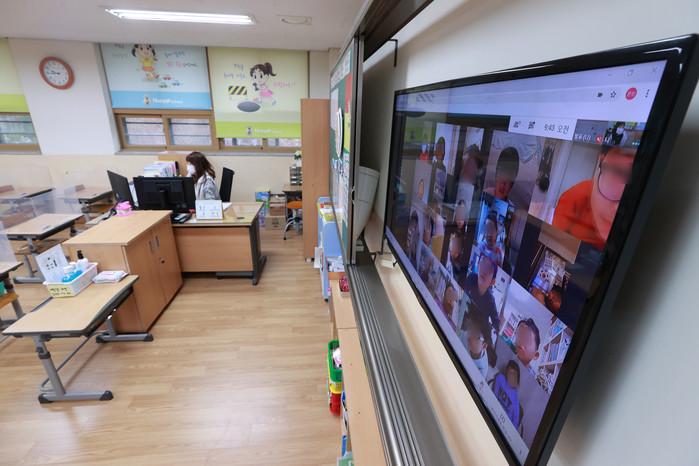 28일 오전 서울 서초구 언남초등학교 1학년 9반 교실에서 임은빈 담임 교사가 학생들과 비대면 온라인 개학식을 하고 있다.