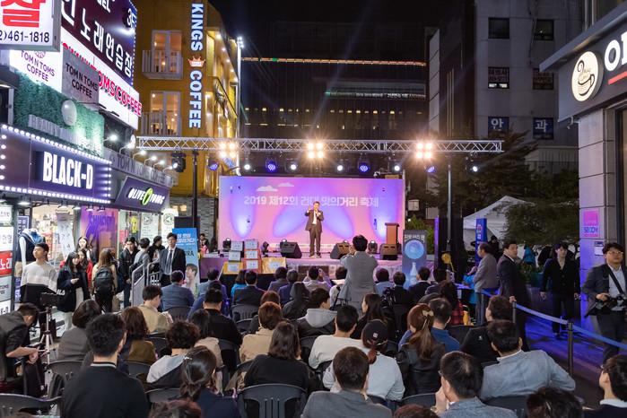 서울 광진구 대표 먹자골목인 화양동 '건대 맛의거리'에서 24일 '음식문화축제'가 열렸다. 건대상가번영회가 주관한 이번 축제는 지역 주민들에게 맛의 거리를 알리고 음식과 문화를 함께 즐기기 위해 마련됐다. 사진은 축제에서 인사말을 하고 있는 김선갑 구청장의 모습.(사진제공=광진구청)