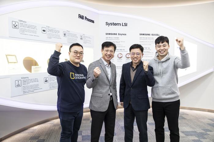 | ▲ 삼성전자 화성캠퍼스에서 삼성전자와 협력사 임직원들이 동반성장을 위한 협력을 다짐하고 있다.(파인텍 최창훈 사원(왼쪽부터), 삼성전자 DS부문 상생협력센터 김창한 전무, 파인텍 이경근 상무, 파인텍 정태관 사원) |