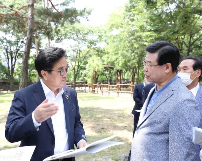성장현 용산구청장이 16일 효창공원을 찾은 우원식 더불어민주당 국회의원(홍범도 장군 기념사업회 이사장)에게 홍범도 장군 유해의 효창공원 안장을 제안했다. 사진은 성 구청장(오른쪽)이 우 의원에게 제안을 설명하는 모습. (사진제공=용산구청)