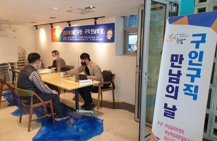 경기 하남시는 지난 29일 ‘구인·구직 만남의 날’을 운영했다. 행사에서는 쿠팡(주)이 입고·출고·상하차 등 3개 직종에서 20여명의 구직자를 대상으로 면접을 진행해 1차로 7명을 선발했다. 사진은 이날 면접이 진행되고 있는 모습. (사진제공=하남시청)