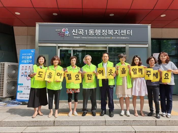 경기 의정부시 신곡1동 지역사회보장협의체는 가족들과 멀리 떨어져 홀로 생활하는 가구를 발굴하고, 지역내 복지 서비스에 대해 알지 못하는 복지사각지대를 해소하기 위해 최근 복지사각지대 발굴 캠페인을 전개했다. 사진은 기념촬영을 하는 모습. (사진제공=의정부시청)