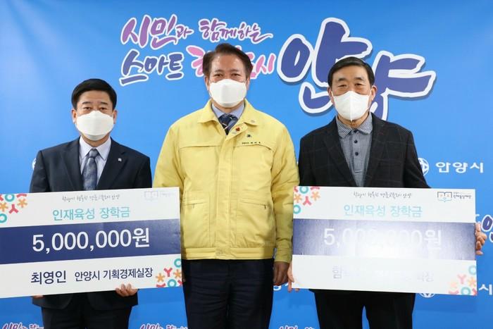경기 안양시 인재육성재단이 최근 함학기 영진교통 회장과 최영인 시 기획경제실장으로부터 기부금을 각각 500만원씩 기탁받았다. 사진은 기탁식에서 최대호 시장(가운데)과 최 실장·함 회장이 기념촬영을 하는 모습. (사진제공=안양시청)