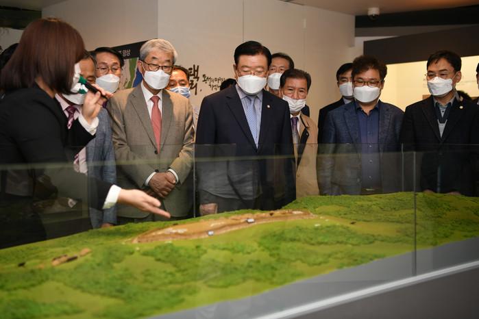 충남 홍성군이 홍주성역사관 개관 10주년을 맞아 고대 마한시대 홍성의 옛 모습을 되돌아보고 그 역사적 가치를 재조명하기 위한 특별기획전 '석택리, 홍성의 마한을 기억하다!'를 오는 11월30일까지 개최한다. 사진은 6일 열린 개막식에 참석한 김석환 군수가 관계자들과 전시관을 둘러보는 모습. (사진제공=홍성군청)