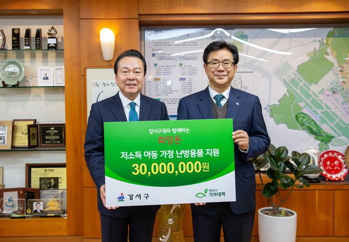 서울 강서구는 4일 구청장실에서 저소득 국제구호개발 NGO 희망친구 기아대책으로부터 저소득층 가구 난방용품 지원비 3000만원을 전달받았다. 사진은 노현송 구청장(왼쪽)과 NGO 희망친구 기아대책 관계자가 함께 기념촬영을 하는 모습. (사진제공=강서구청)