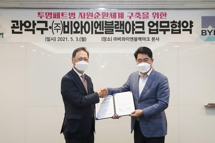 [시민일보 = 여영준 기자] 서울 관악구(구청장 박준희)가 (주)비와이엔블랙야크와 최근 블랙야크 양재사옥에서 ‘투명페트병 자원순환체계 구축 업무협약’을 체결했다.