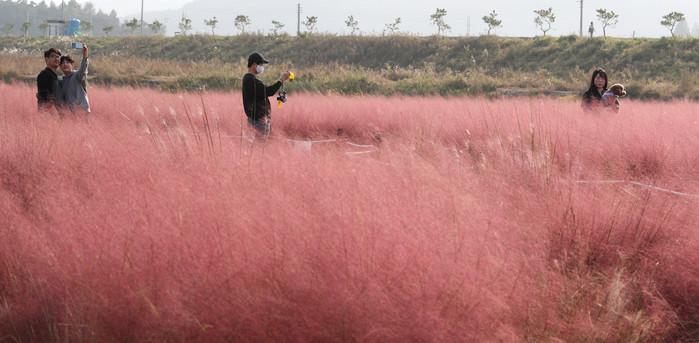 지난 19일 오후 충남 공주시 유구천변에 조성된 핑크뮬리 속에서 시민들이 깊어가는 가을을 만끽하고 있다.