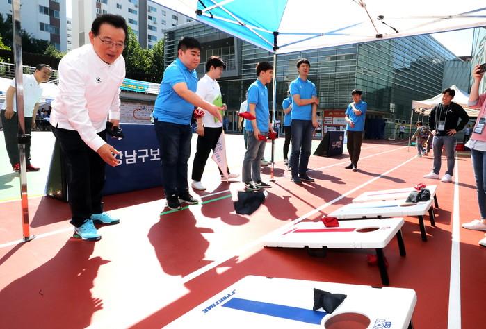 24일 서울 강남구 일원동 밀알학교에서 전국 최초로 발달장애인 건강축제 ‘2019 우리동네 스페셜 운동회’가 개최됐다. 사진은 행사에 참가한 정순균 구청장(왼쪽)이 대회 참가선수들과 함께 놀이형 신체활동 프로그램 ‘고홀’을 체험하는 모습. (사진제공=강남구청)