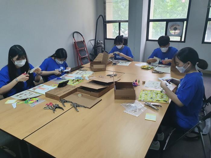 ▲ 봉사단원들이 기억상자를 만들고 있는 모습. (사진제공=bhc치킨) |