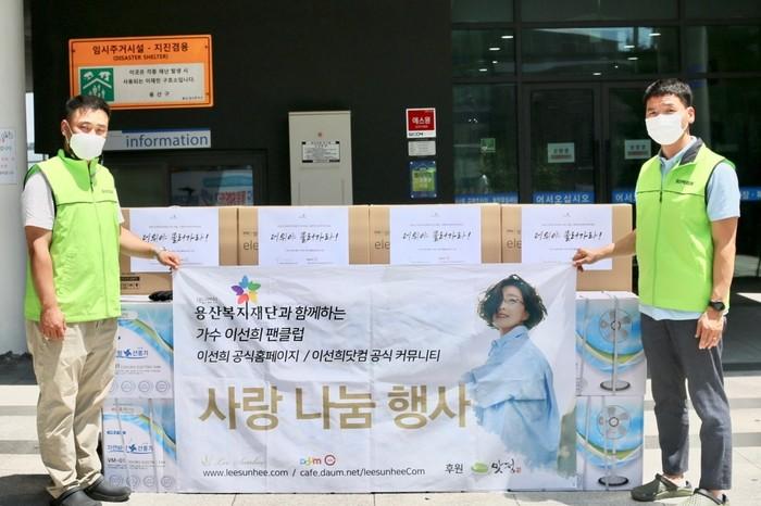 서울 용산복지재단은 29일 가수 이선희 팬클럽, 다음카페 이선희닷컴 공식커뮤니티로부터 이선희 데뷔 37주년을 기념해 취약계층 여름나기를 지원하기 위한 선풍기 50대를 기탁받았다. 재단은 기부받은 물품을 지역내 저소득층 가구에 전달할 예정이다. 사진은 전달식에서 관계자들이 기념촬영을 하는 모습. (사진제공=용산구청)